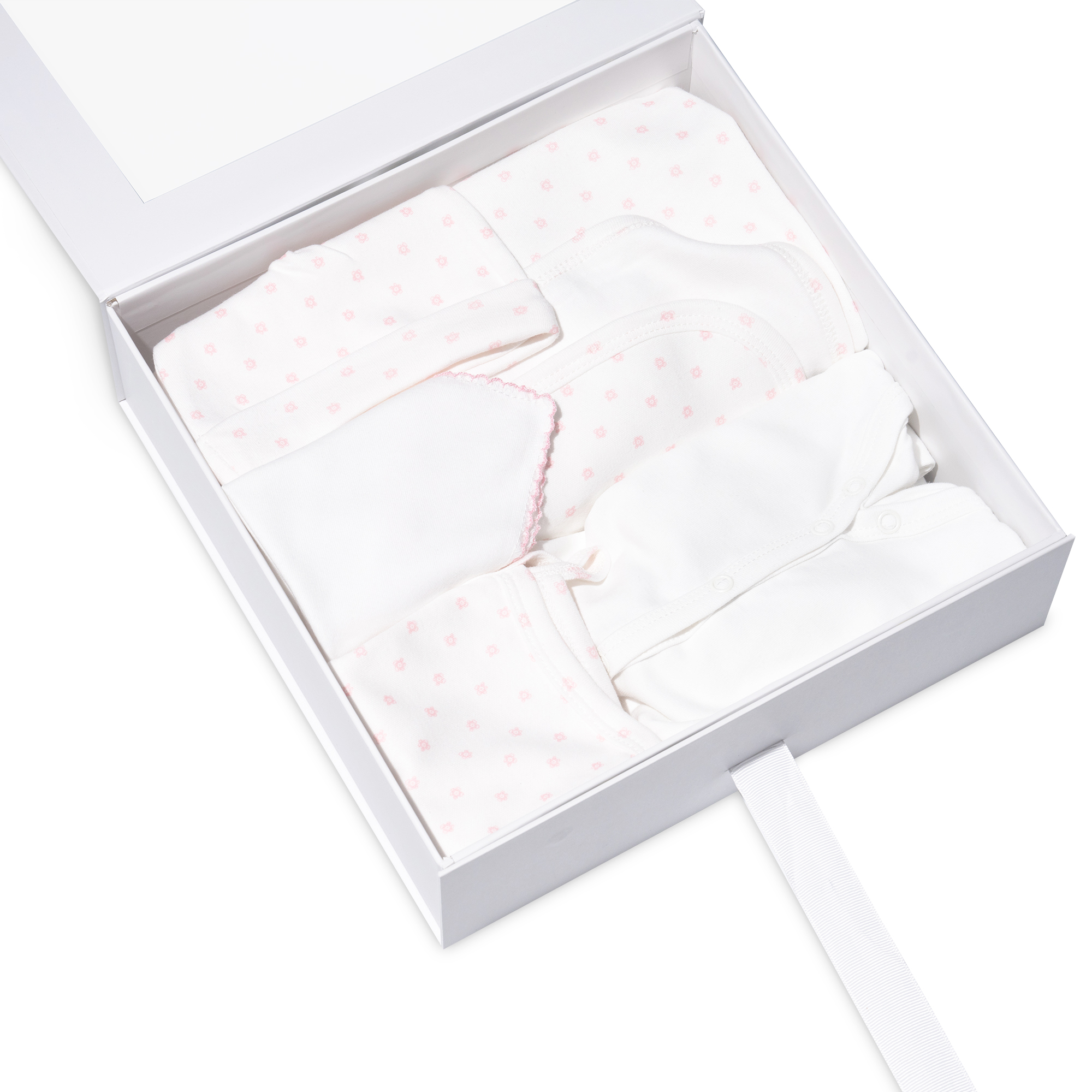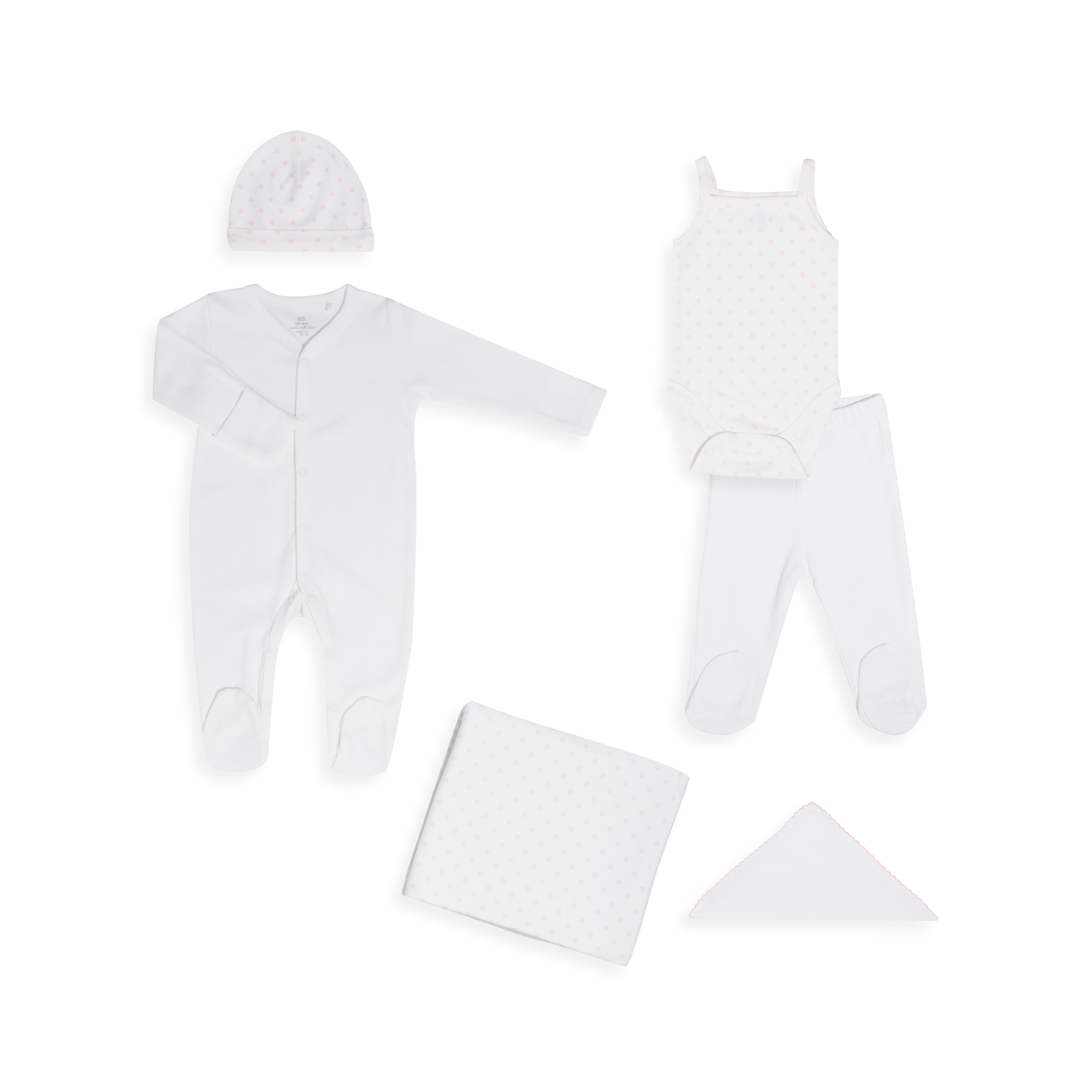 Բարձրորակ մանկական հավաքածու՝ նախատեսված նորածինների համար։ Պատրաստված է 100% բարձրորակ բամբակից, որը իդեալական է փոքրիկի նուրբ մաշկի համար և ապահովում է հարմարավետություն ամբողջ օրվա ընթացքում՝ առաջին օրերից սկսած։ Նուրբ գունային լուծումը և փոքրիկ ծաղկային դետալները հավաքածուն դարձնում են գեղեցիկ ու նրբագեղ։ Հարմարավետ ձևվածքը թույլ է տալիս ազատ շարժվել՝ ապահովելով երեխայի լիարժեք հարմարավետությունը։ Հավաքածուն ներառում է՝ երկարաթև կոմբինեզոն (ոտնավոր), անթև բոդի, ոտնավոր տաբատ, գլխարկ, ծածկոց և թաշկինակ։ Հիանալի ընտրություն է ինչպես առօրյա օգտագործման, այնպես էլ նվերի համար։ Բաղադրություն՝ 100% բամբակ։